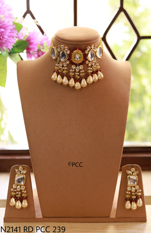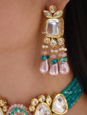 Aarohi Royal Kundan Meenakari Choker Set by Pinkcity Craft features a central Meenakari motif surrounded by sparkling, Kundan stones and delicate clusters of onyx beads. Intricately hand-strung quartz drops cascade from the design, adding movement and charm to the regal silhouette. The matching earrings mirror the choker’s grandeur, making this set a standout for bridal or festive occasions. Wear it to let traditional artistry shine through with elegance and style.