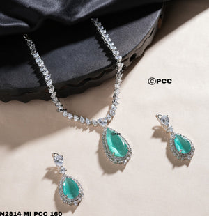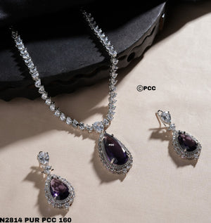 The Aurora Teardrop Set by Pinkcity Craft dazzles in a range of centerpiece color variations, including purple and pastel blue. Each set features an elegant teardrop-shaped central stone, perfectly encircled by dual rows of sparkling American diamond accents and suspended from a tapering, prong-set diamond chain. The matching earrings echo the pendant’s radiant teardrop form, creating a cohesive look for every bridal, festive, or evening occasion. Each gemstone option exudes a unique mood—regal, romantic, fresh, or classic—letting you choose the perfect palette for your style.
