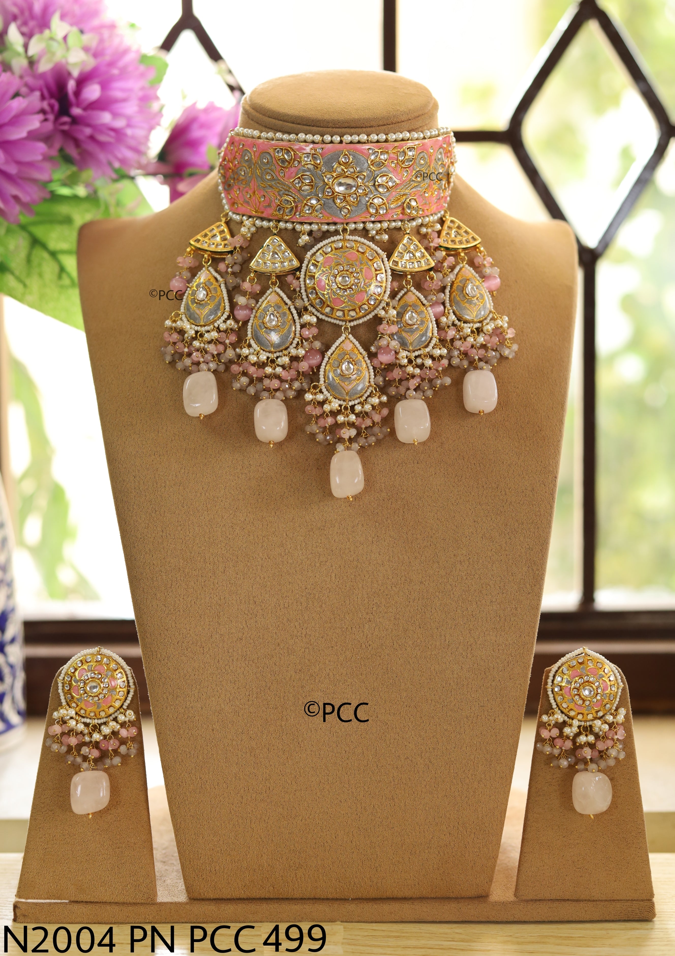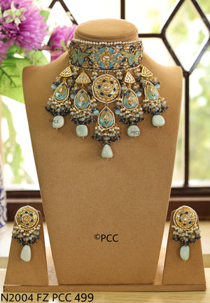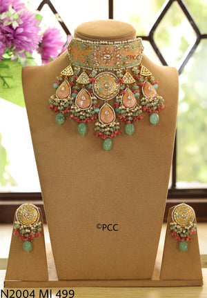 Pinkcity Craft presents the Handmade Bridal Heavy Royal Hasli Necklace & a pair of earrings. This Traditional Rajasthani Royal Kundan Meena Hasli Necklace ensures comfort and a stunning look, making it an ideal choice for the bride.