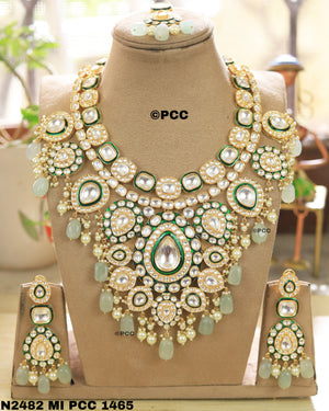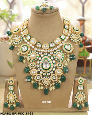 Vintage Heirloom Uncut Polki Bridal Necklace Set by pinkcity  Craft features dramatic layers of uncut polki diamonds, highlighted with lush green enamel, opulent gold detailing, and fluid arrangements of dangling quartz and pearl drops. The statement centerpiece and matching earrings are crafted in classic chandbali and floral motifs, celebrating royal Mughal artistry and luxurious heritage. This set is meticulously handcrafted for a bride seeking grandeur and timeless elegance.