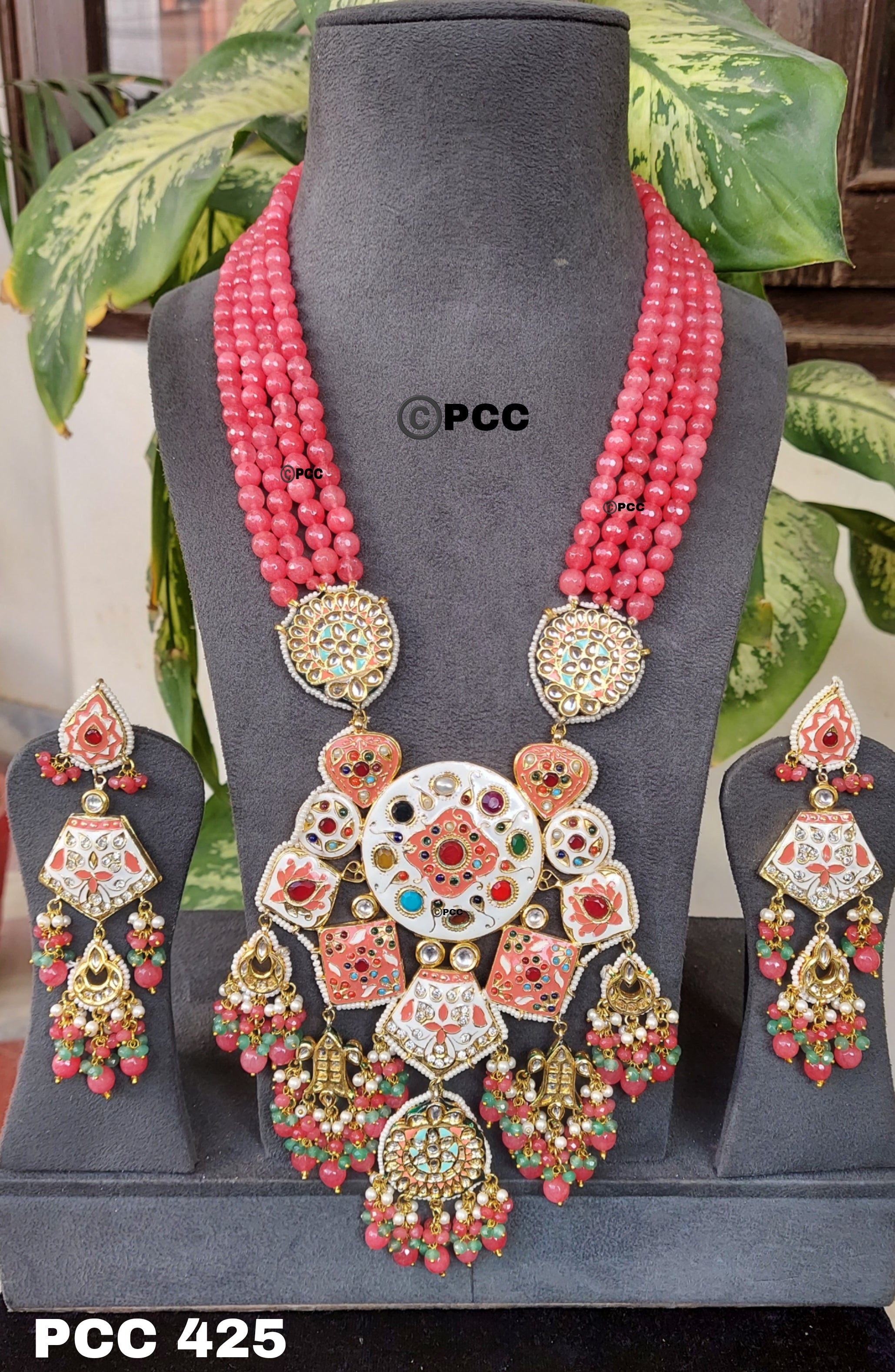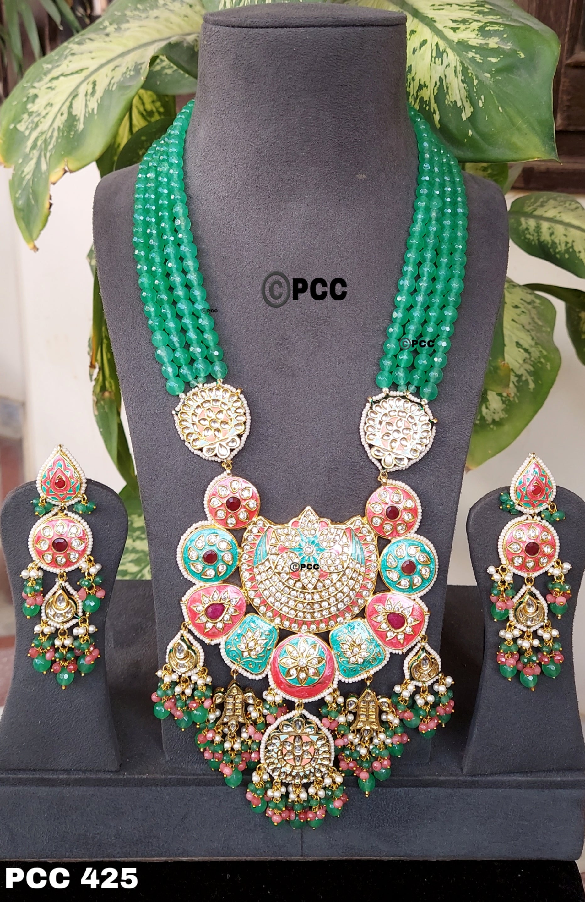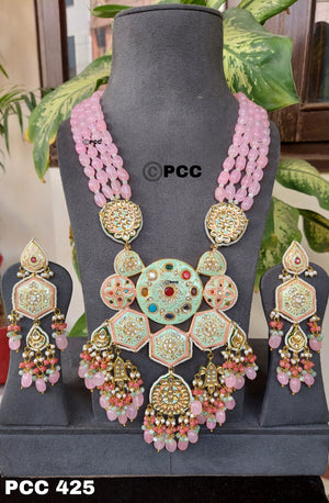 Meenaya Rajwada Long Necklace Set by Pinkcity Craft is an exquisite ode to royal grandeur, featuring intricate meenakari artistry and vibrant pastel detailing. Designed with five rows of luminous quartz beads, this set showcases a majestic central medallion adorned with multicolored meenakari enamel and sparkling polki accents. Each pendant element and motif is carefully crafted to evoke the splendor of Rajasthan’s heritage. At the same time, the matching earrings echo the regal charm with their tiered design and soft bead clusters.