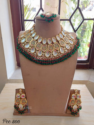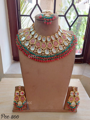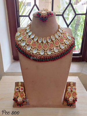 Make a grand statement with our PCC 800 Kundan Necklace Set, an exquisite blend of traditional artistry and vibrant elegance. This heavy choker set features hand-set tear-drop Kundan stones, intricate Meenakari floral designs, and rich multi-layered bead detailing in four stunning color combinations – Red-Green, Green-Maroon, Blue, and Pink-Green.