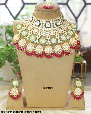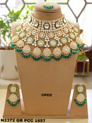 Heirloom Polki Bridal Necklace Set by Pinkcity craft dazzles with exquisite uncut polki diamonds, vibrant emerald accents, and traditional kundan craftsmanship. The intricate layered design beautifully balances ornate floral motifs and bold gemstone drops, making it the perfect regal statement for bridal occasions. The complemented earrings and matching maang tikka add to the set’s majestic appeal, creating a timeless treasure for weddings and grand celebrations.