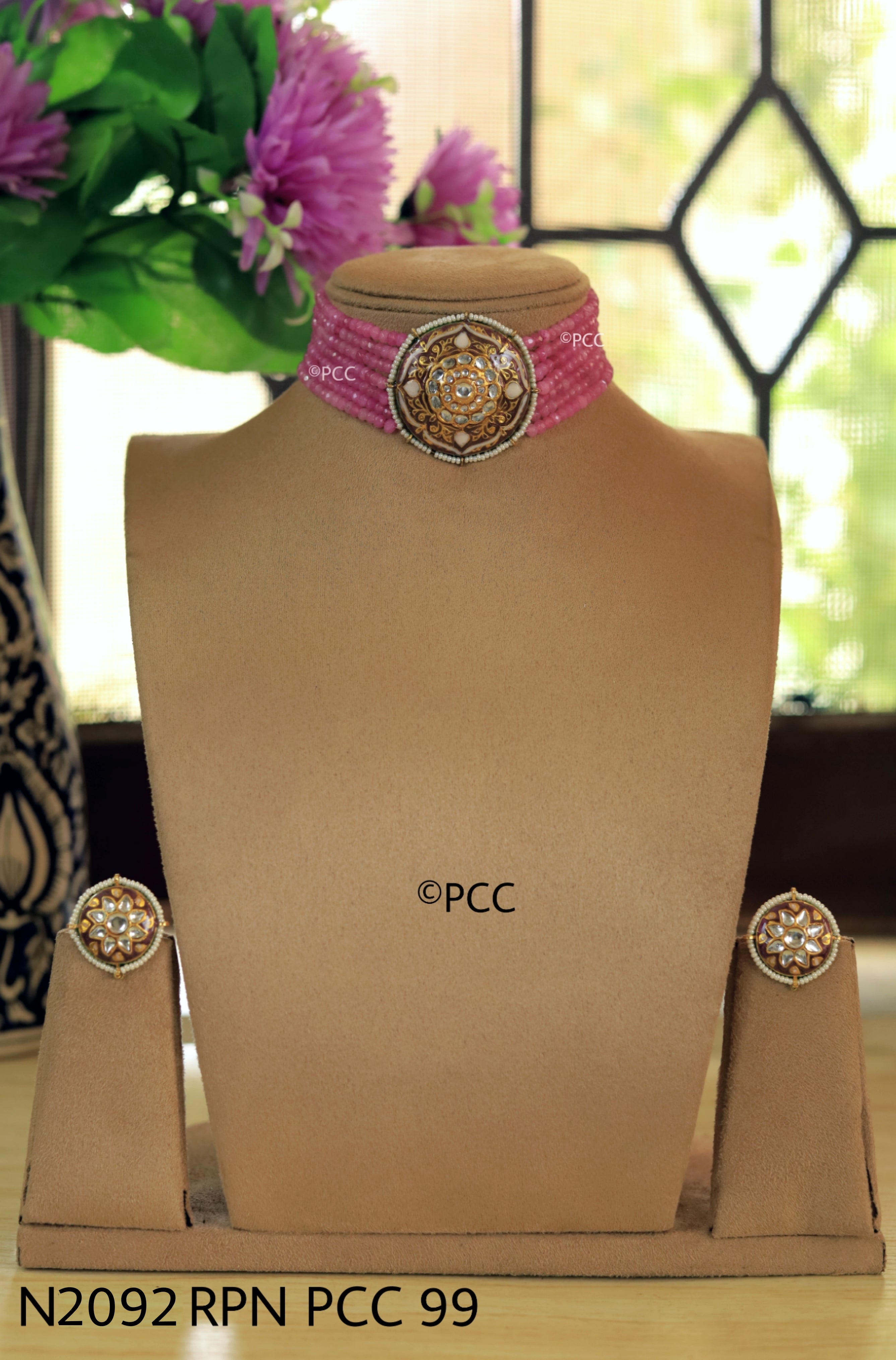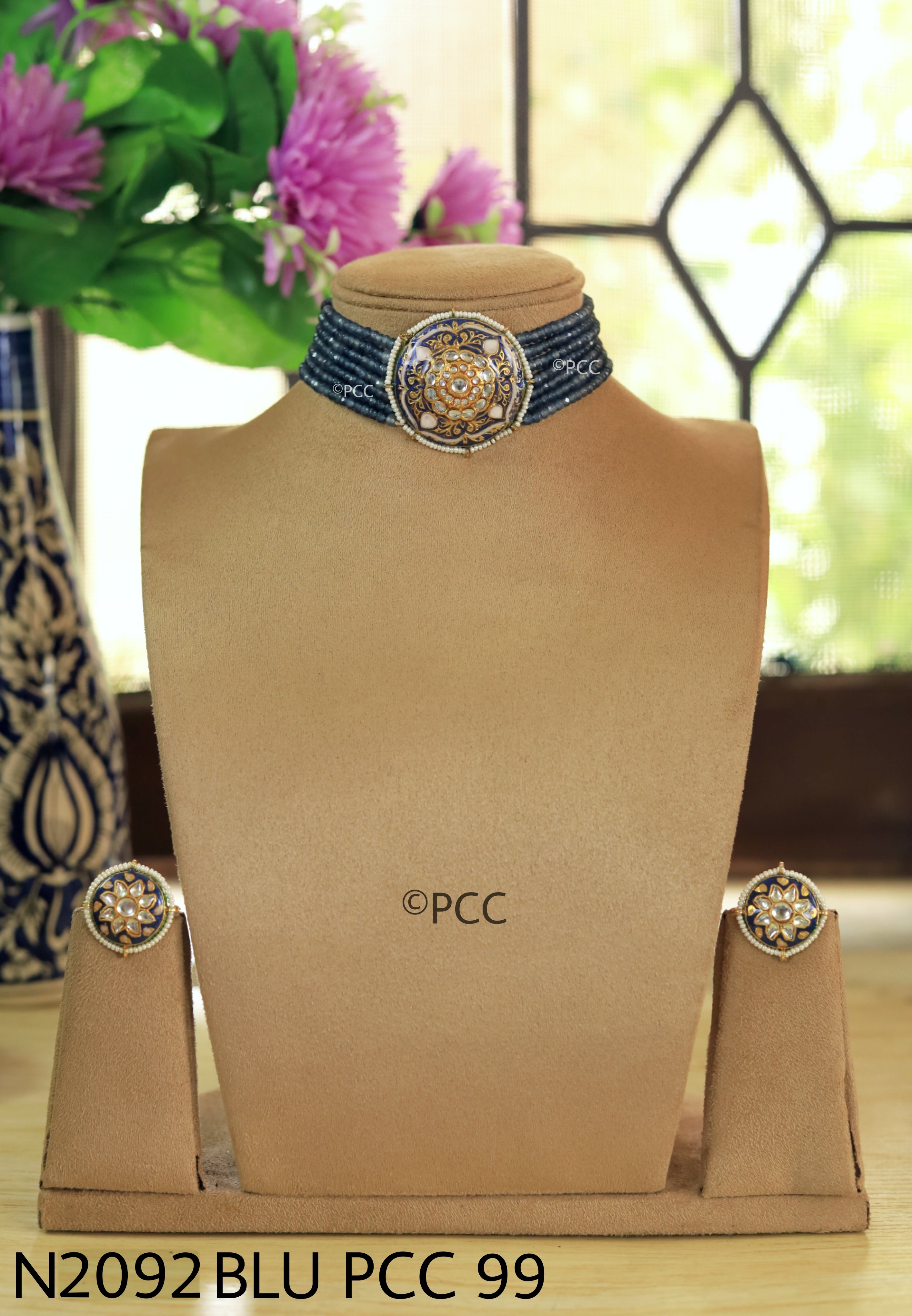 Traditional designer choker necklace set made with Brass Metal, semi precious onyx beads, Kundan, Meena Work. Indian style artisan made wedding necklace jewelry. Handmade beautiful Necklace with earrings