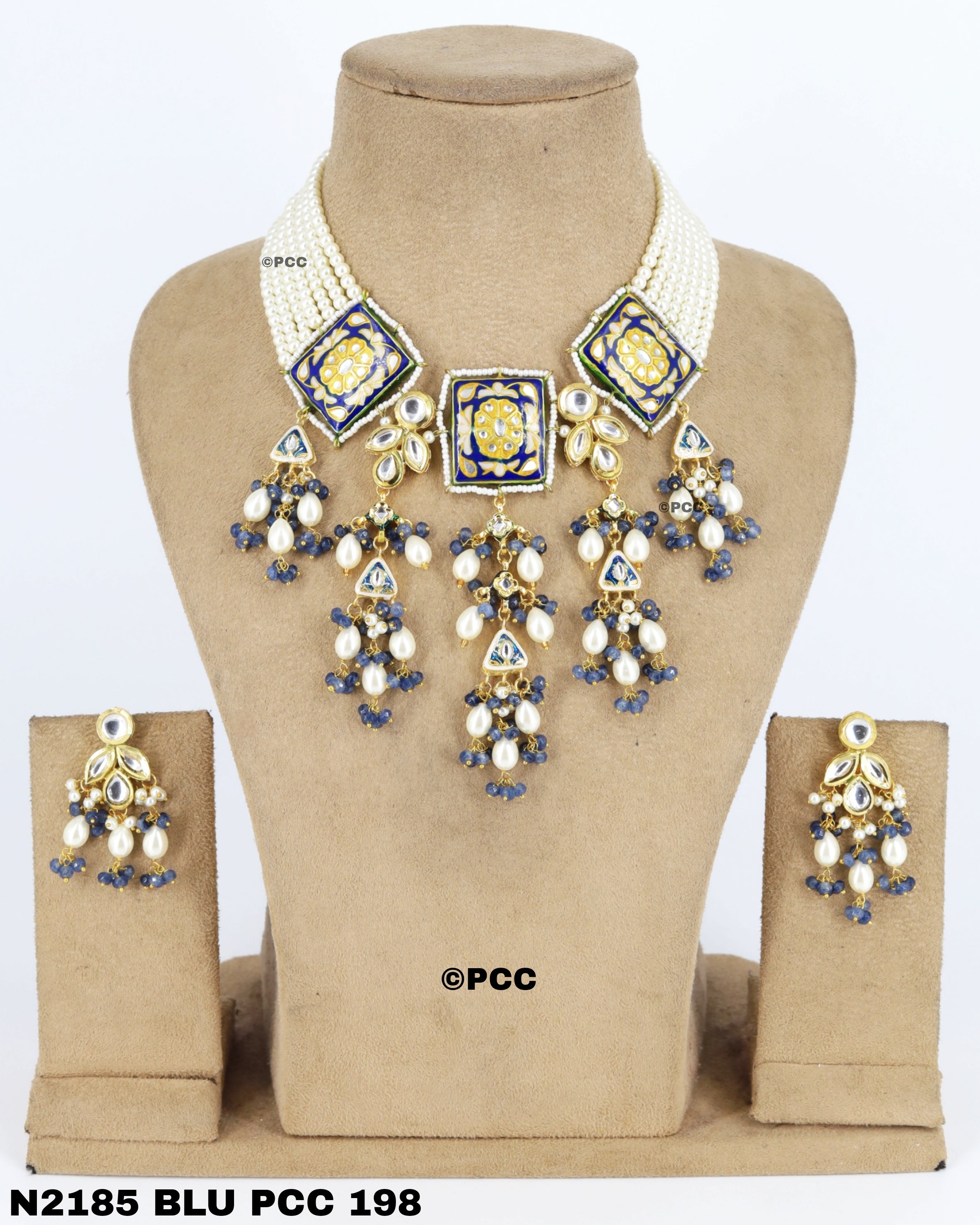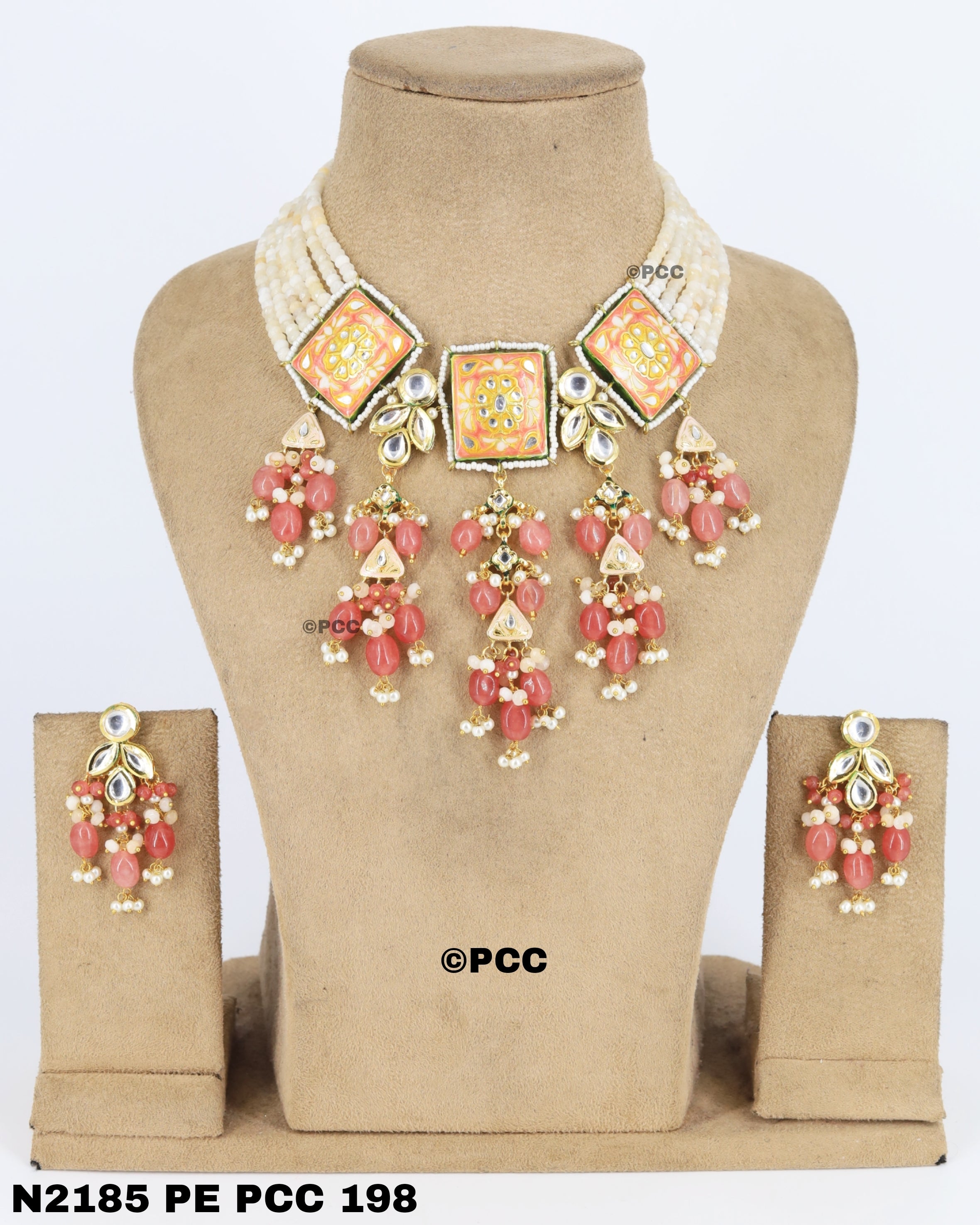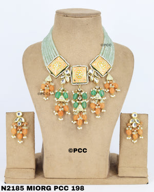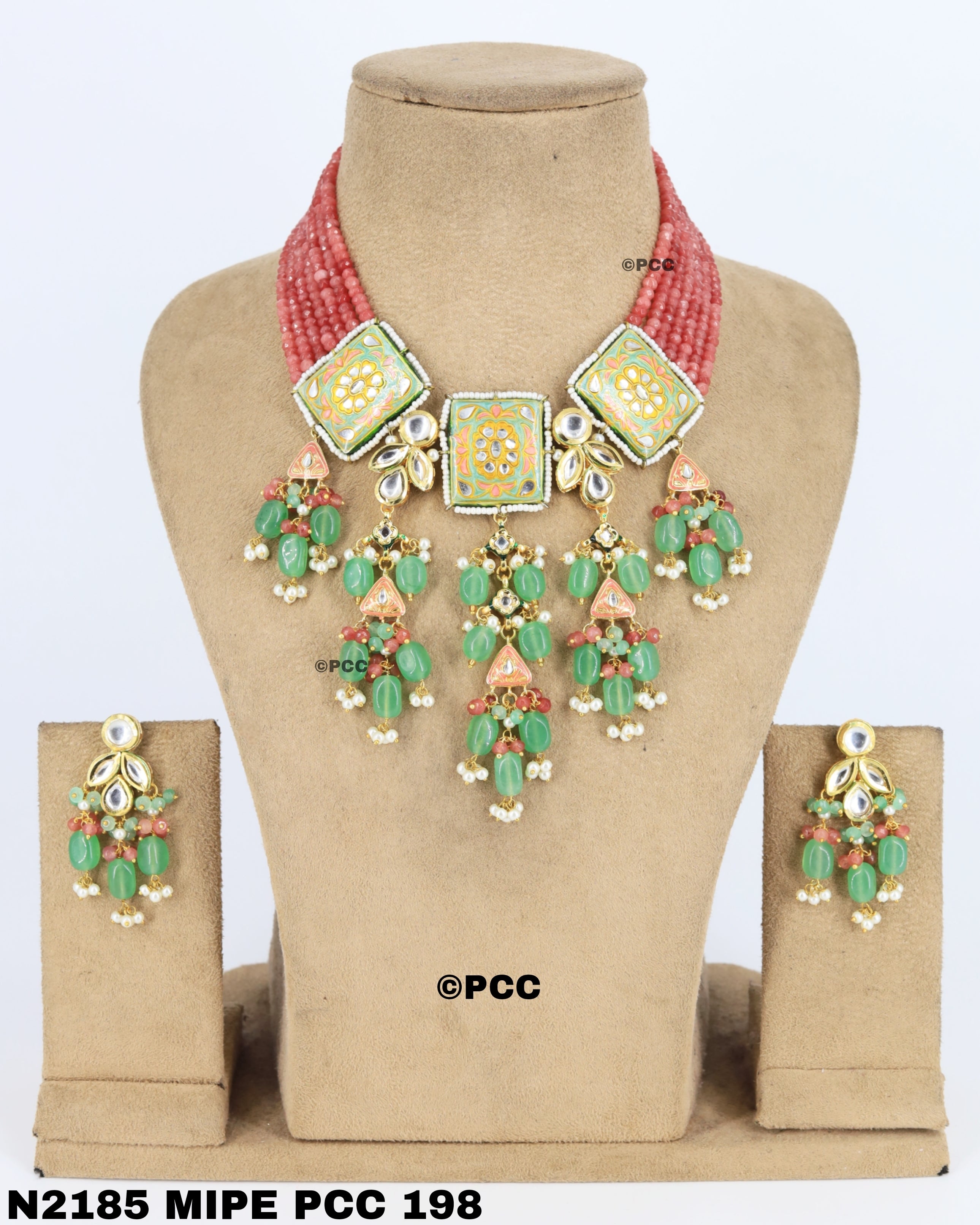 Make a royal statement with this stunning handcrafted Meenakari Kundan necklace set, featuring intricate enamel work, lustrous green beads, and sparkling kundan stones. The bold square pendants are adorned with traditional floral Meenakari designs in vibrant hues of green, yellow, and pink. Accentuated with dangling pearl and gemstone clusters, this necklace is perfect for weddings, bridal wear, festivals, or any grand occasion. Paired with matching earrings, this masterpiece blends heritage craftsmanship with modern elegance. Elevate your ethnic look with this timeless piece of Indian jewelry.