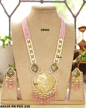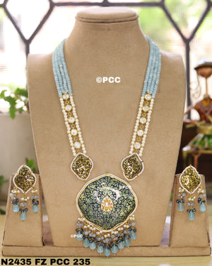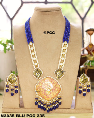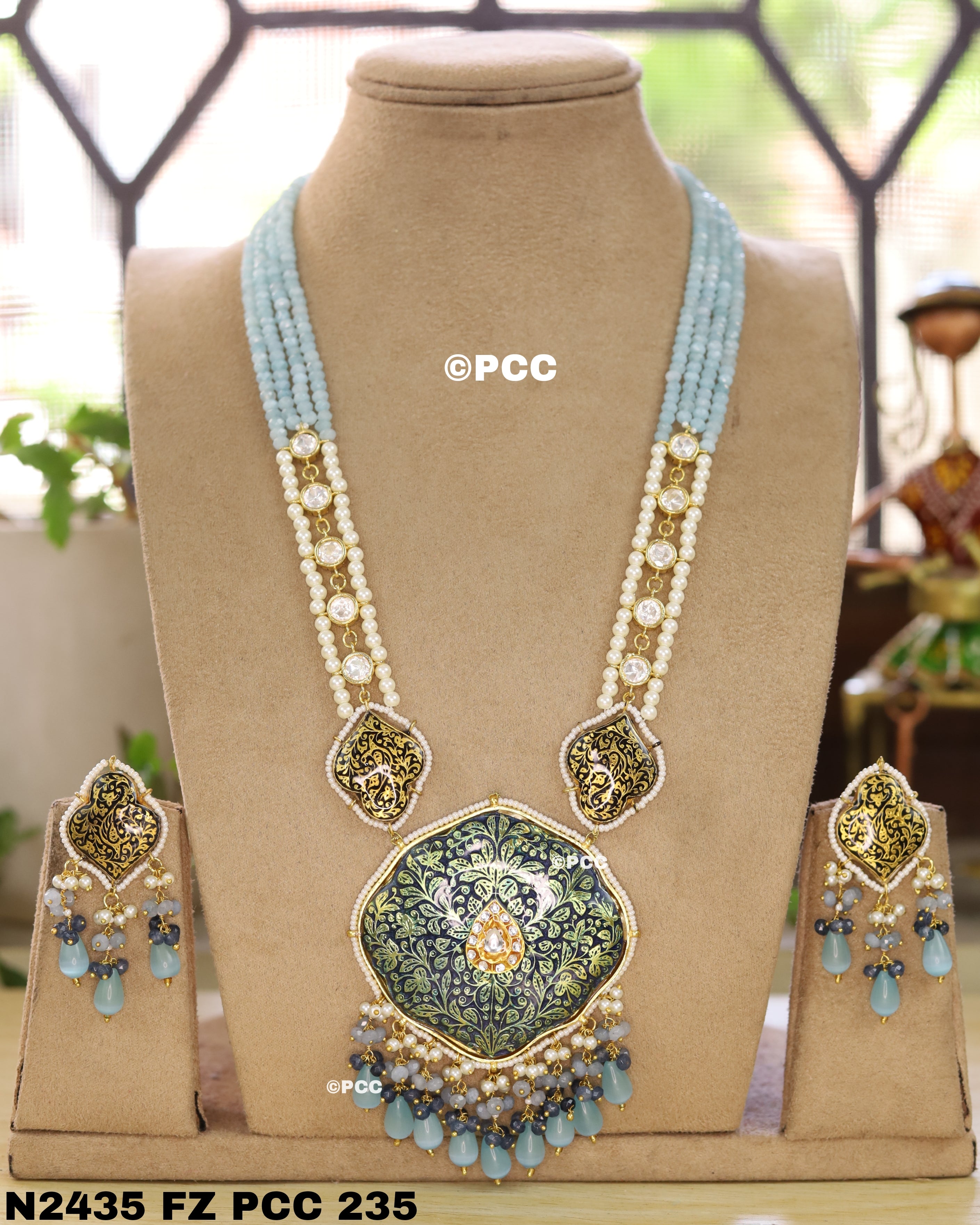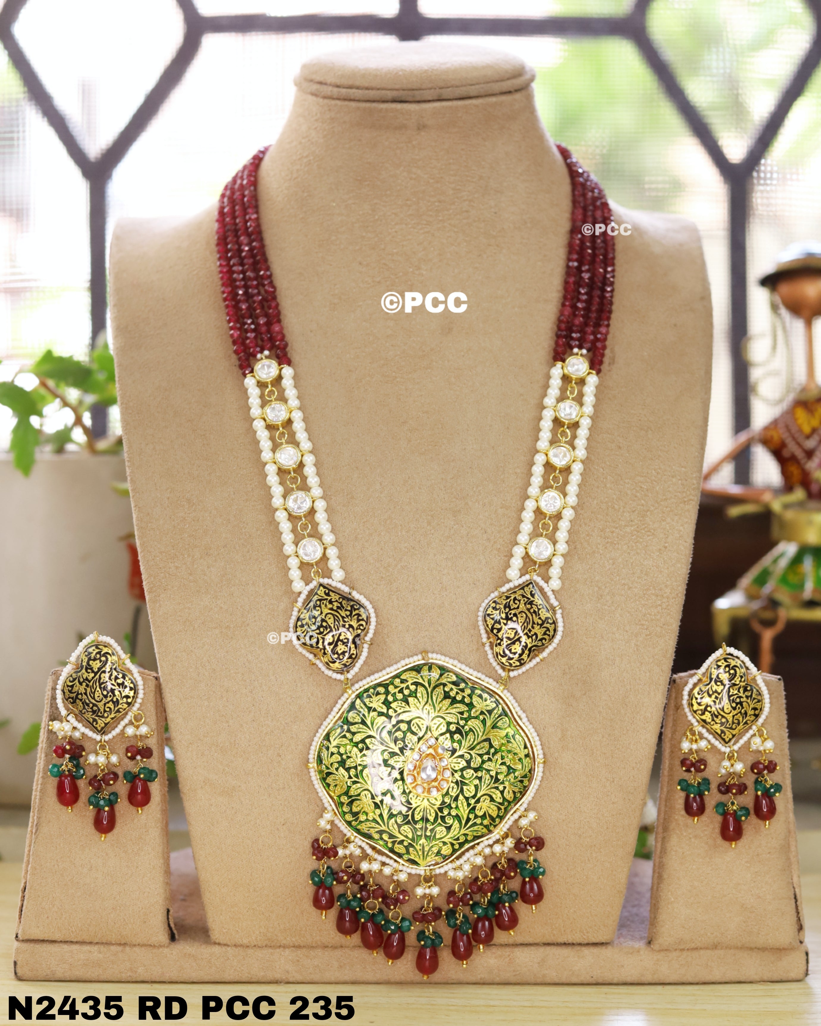 Rajwada Traditional Long Necklace Set by Pinkcity Craft features multi-strand onyx beads paired with intricate enamel panels and a grand pendant, highlighted by regal motifs and luxurious quartz drops. Ornate detailing and a fusion of classic and contemporary elements evoke noble heritage, making this set ideal for festive and bridal occasions. The matching earrings accentuate the set’s rich artisan craftsmanship and opulent style.