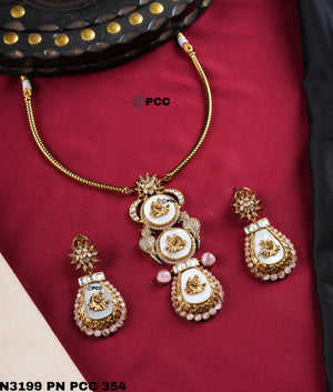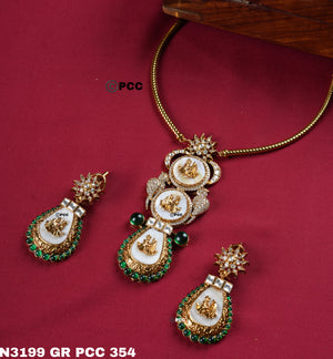 Royal Polki Fusion Necklace Set by Pinkcity Craft brings together the elegance of heirloom motifs and contemporary flair. Featuring prominent Polki work, blush pink beading, and stacked medallion elements that evoke regal sophistication, this set stands out for its unique arrangement and dazzling craftsmanship. Matching drop earrings complete the look, creating a versatile ensemble for weddings, festivities, or cultural celebrations.